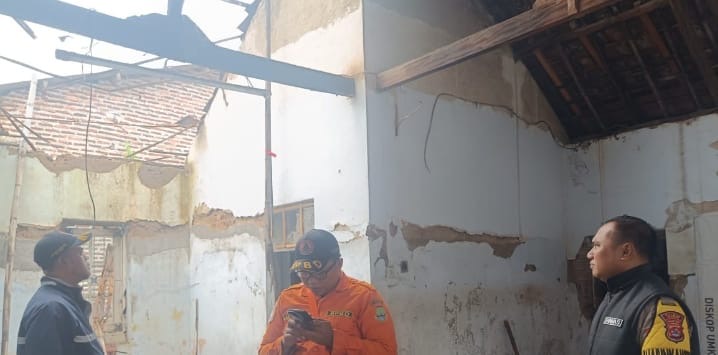 Bhabinkamtibmas Kelurahan Pabean, Aipda Anton Sudrajat dari Polsek Purwakarta Polres Cilegon, melakukan pemeriksaan langsung ke rumah warga yang mengalami kerusakan atap roboh akibat cuaca ekstrem di Lingkungan Karang Tengah, Kampung Telu