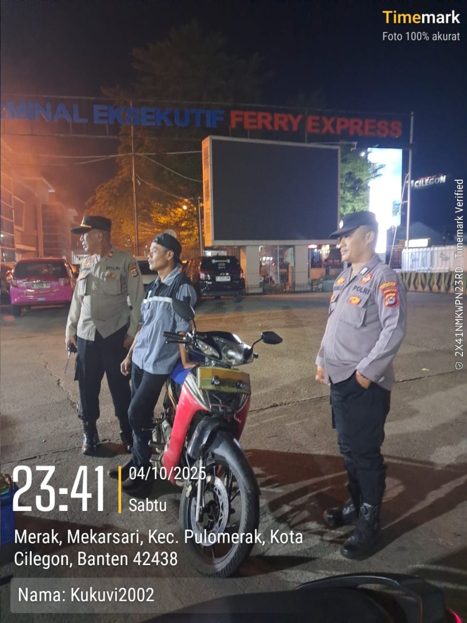 Cilegon - Personil Polsek Kskp Merak Polres Cilegon melaksanakan patroli di kawasan pelabuhan merak memberikan rasa aman dan damai, Minggu (05/10/2025)