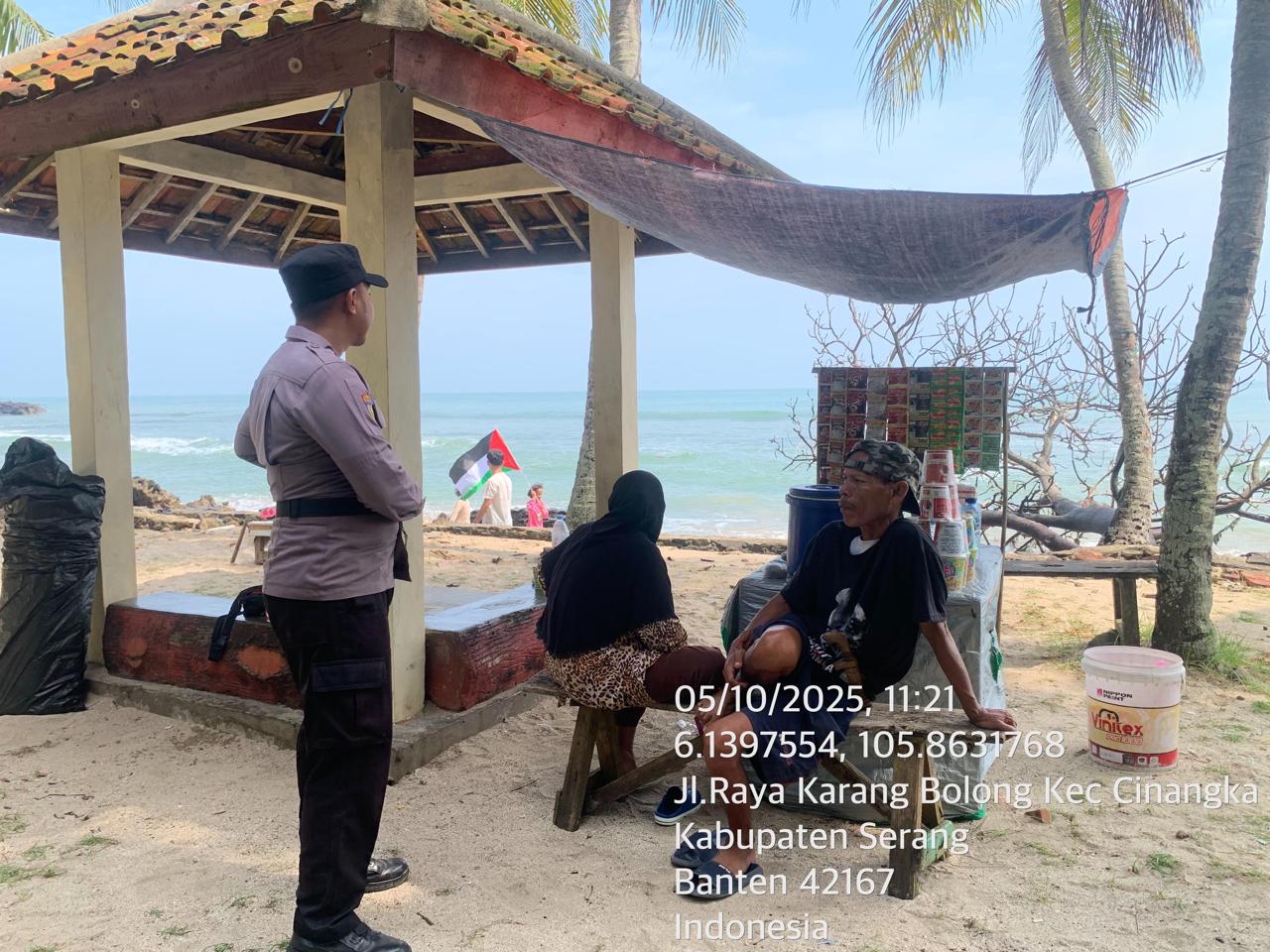 _*POLRES CILEGON*_ | Polsek Cinangka Polres Cilegon Polda Banten melaksanakan kegiatan patroli Serta memberikan Himbauan kepada pengunjung pantai yang berwisata dan Sambang kepada petugas penjaga pantai dan juga antisipasi harkamtibmas di Wilayah Hukum Polsek Cinangka Polres Cilegon Polda Banten, Minggu (05/10/2025).