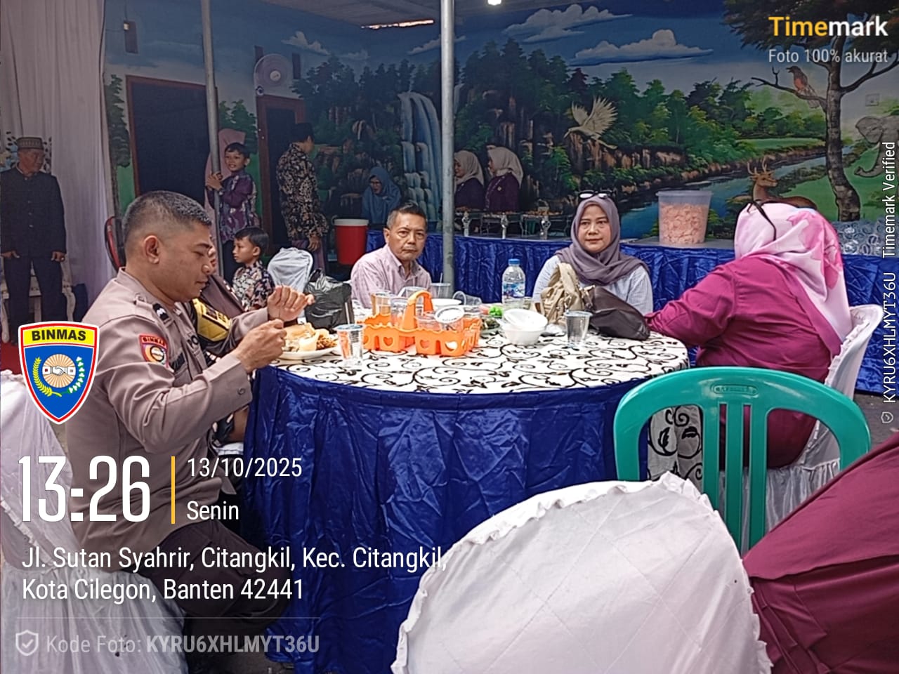 Cilegon - Bhabinkamtibmas Polsek Ciwandan Polres Cilegon Polda Banten melaksanakan Kegiatan Kondangan/Undangan ini bertujuan untuk memastikan acara berlangsung dengan aman dan tertib, serta memberikan rasa aman kepada warga yang menghadiri resepsi pernikahan tersebut,Senin (13/10/2025).