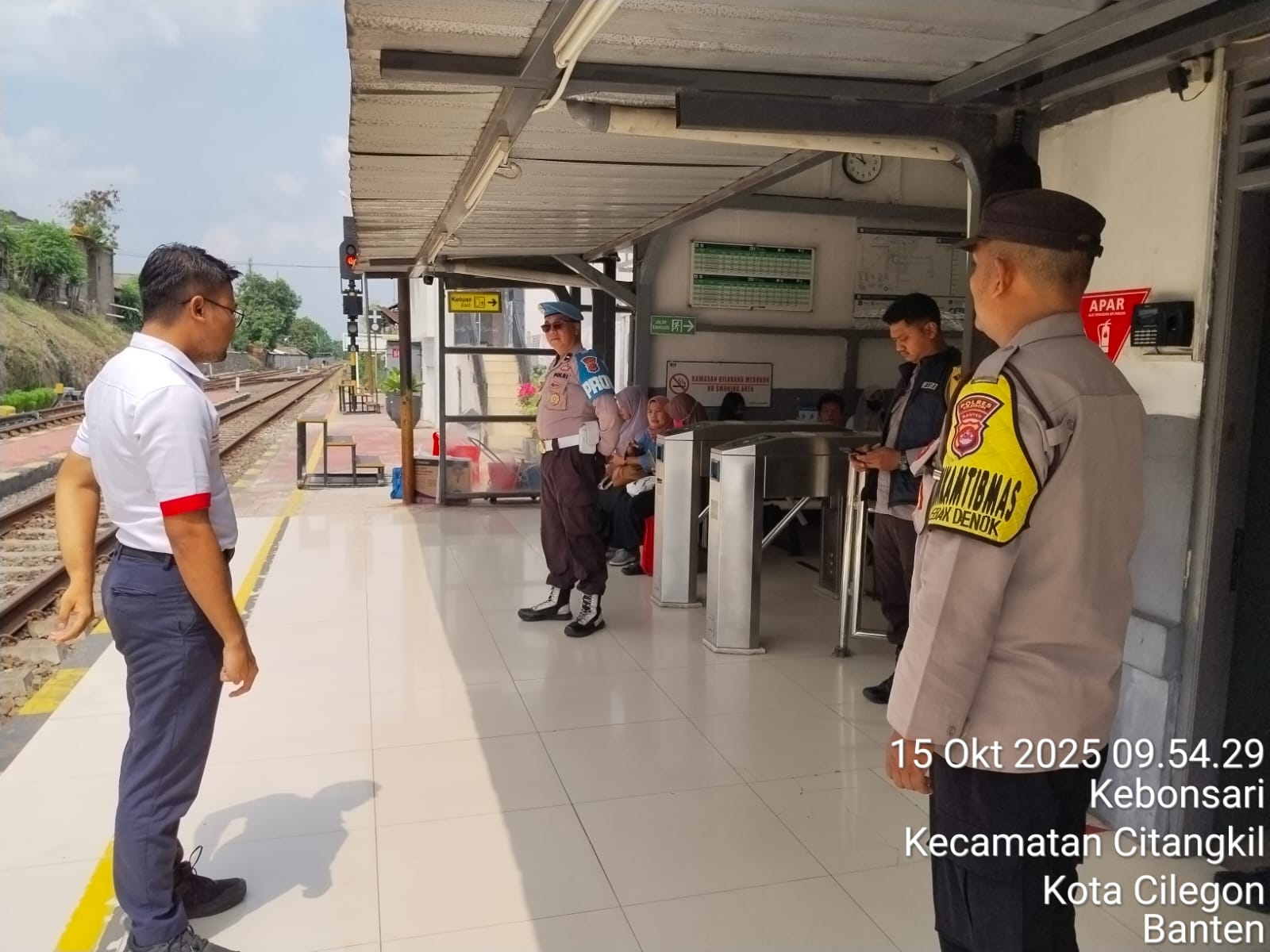 Cilegon - Personil Polsek Ciwandan Polres Cilegon Polda Banten melaksanakan giat patroli Dan dengan sambangi Petugas Stasiun Kereta Api dan penjaga pintu perlintasan kereta api,Rabu (15/10/2025).