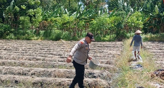 personel Babinkamtibmas yang bertugas di Kelurahan Kebondalem, Kecamatan Purwakarta, Kota Cilegon, menunjukkan kepeduliannya terhadap masyarakat dengan membantu kelompok tani setempat dalam kegiatan penanaman jagung