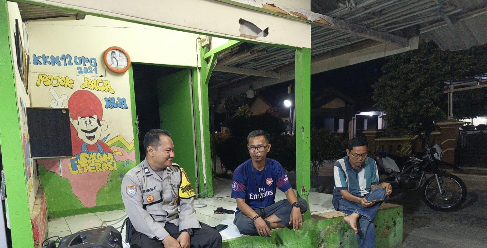 Cilegon - Personel Bhabinkamtibmas Polsek Anyar Polres Cilegon Polda Banten Aiptu Irvan melaksanakan sambang Ronda Siskamling Dalam rangka menjaga Harkamtibmas dan Sebagai bentuk mendukung Program Quick Wins Presisi Polri, Sabtu (01/11).