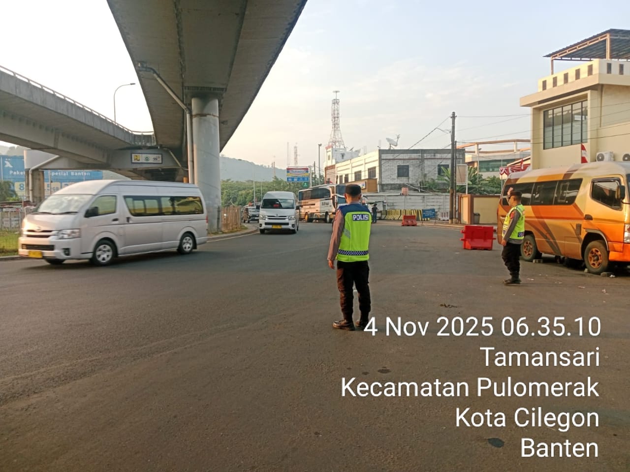 Personel Polsek KSKP Merak Atur Kendaraan Roda Empat di Pelabuhan Merak Demi Kelancaran Penyeberangan