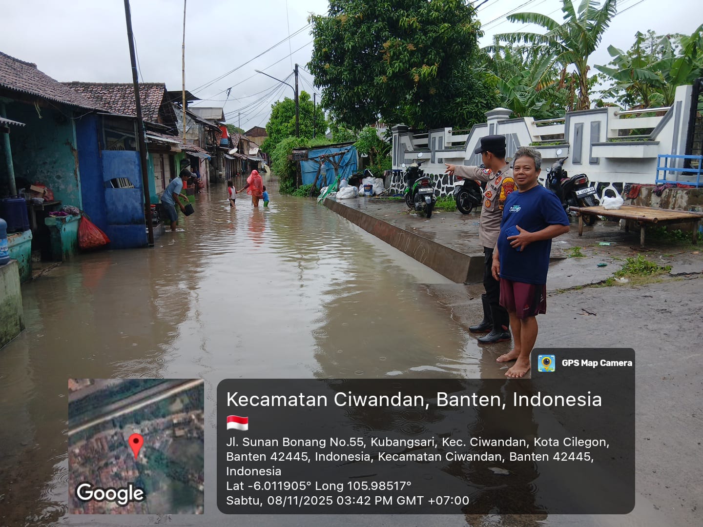 Cilegon - Bhabinkamtibmas Dan Lurah Kubangsari Mengecek Dapur Umum untuk Masyarakat Yang Terdampak Genangan Air pukul 16.07 WIB di lingkungan Cigading pasar Rt 01/02 Kelurahan Kubangsari Kecamatan Ciwandan, Sabtu (08/11/2025).