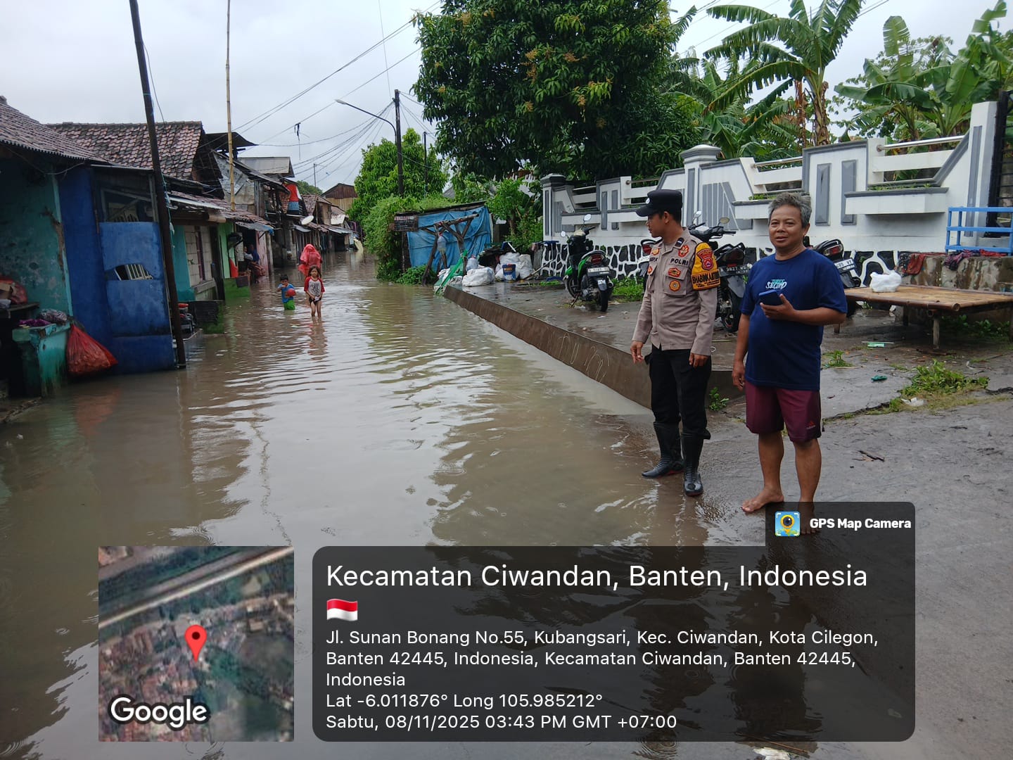 Cilegon - Bhabinkamtibmas Dan Lurah Kubangsari Mengecek Dapur Umum untuk Masyarakat Yang Terdampak Genangan Air pukul 16.07 WIB di lingkungan Cigading pasar Rt 01/02 Kelurahan Kubangsari Kecamatan Ciwandan, Sabtu (08/11/2025).