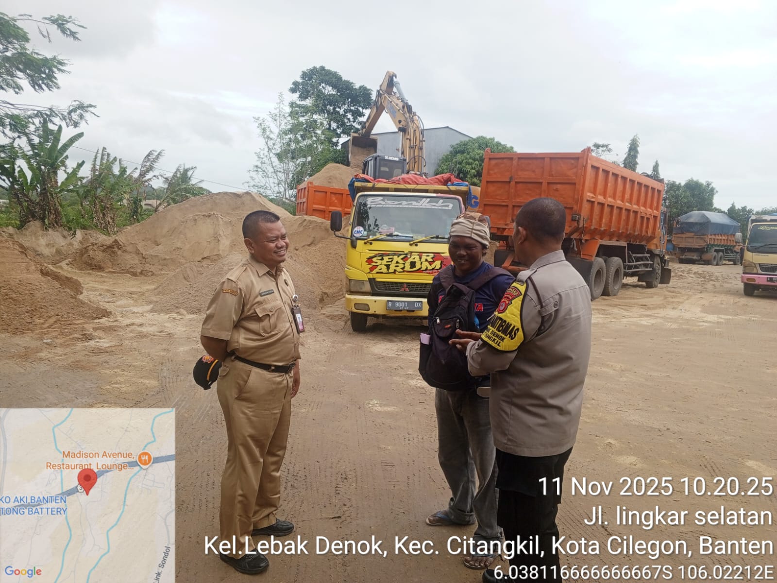 Cilegon - Panit Lantas Polsek Ciwandan IPTU Deni Mulyana dan Bhabinkamtibmas Kelurahan Tamanbaru AIPDA Ediyanto melaksanakan monitoring stokfile pasir di Lingkungan Kubang Lesung Pabuaran PT. Pamungkas Perkasa, Kelurahan Tamanbaru, Kecamatan Citangkil, Kota Cilegon, Selasa (11/11/2025).