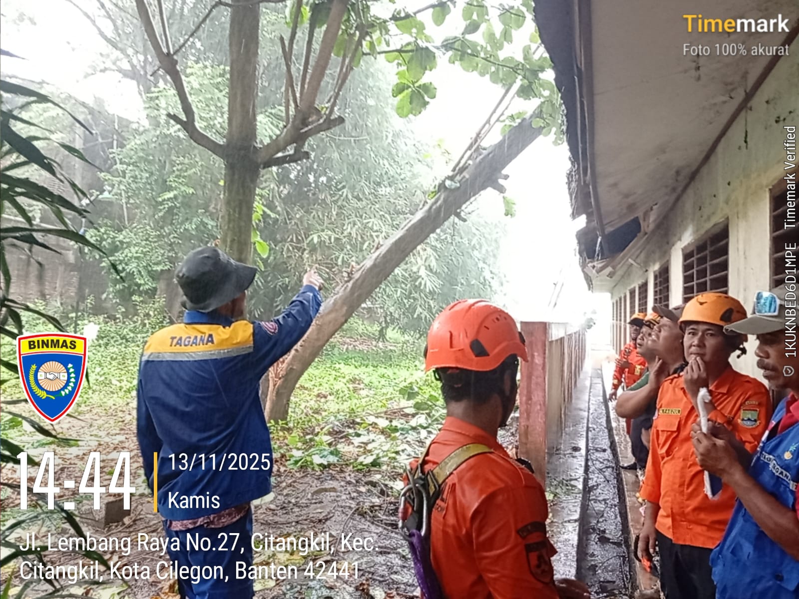 Cilegon - Pohon ketapang tumbang dan menimpa gedung SDN Tegal Cabe, Lingkungan Tegal Cabe RT 04/02, Kelurahan Citangkil, Kecamatan Citangkil, Kota Cilegon, Kamis (13/11/2025).