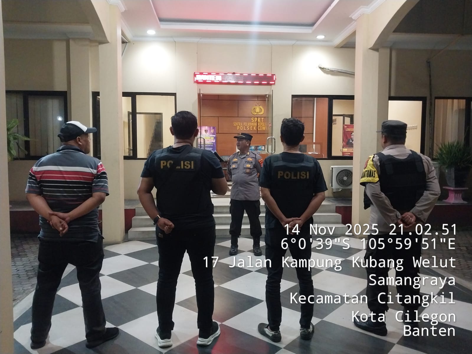 Cilegon - Personil Polsek Ciwandan Polres Cilegon Polda Banten menggelar apel malam Persiapan Patroli yang dipimpin Oleh Pawas Kanit Samapta Polsek Ciwandan AKP Sarpan, Minggu (16/11/2025).