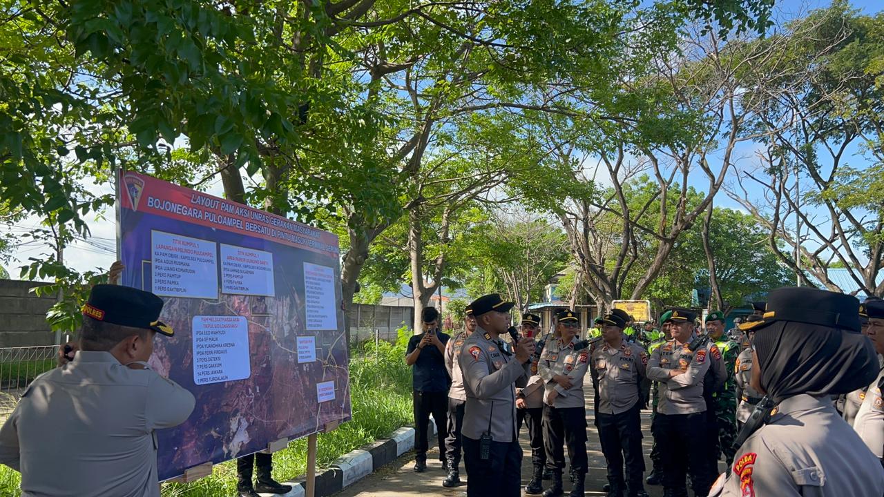 Polres Cilegon melaksanakan pengamanan kegiatan aksi unjuk rasa dari Gerakan Masyarakat Bojonegara–Puloampel Bersatu yang berlangsung di pintu masuk Terminal Seruni, Kota Cilegon.