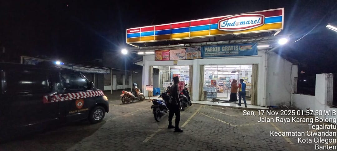 Cilegon - Patroli ini digelar oleh personil Polsek Ciwandan Polres Cilegon Polda Banten untuk Menekan Gangguan Kamtibmas dan mengantisipasi aksi kriminalitas Pada Jam-jam Rawan di pertokoan ataupun minimarket ,Di samping Patroli petugas juga melakukan himbauan dialogis baik dengan karyawan maupun para pengunjung, Senin (17/11/2025).
