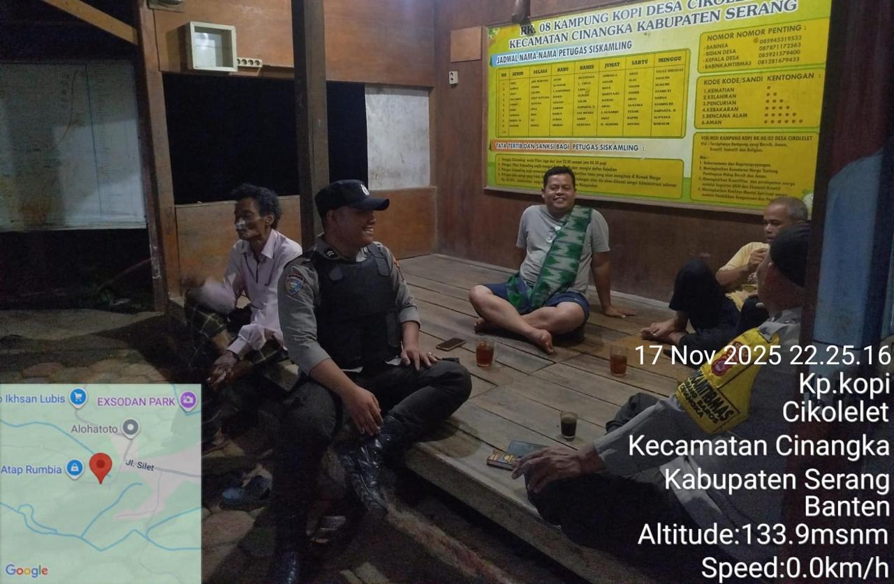 *Polres Cilegon* || Personel Bhabinkamtibmas Polsek Cinangka melaksanakan Program Komandan Wish Kapolda Banten RONDA SATKAMLING menyampaikan komunikasi dengan Petugas Siskamling agar berperan aktif dalam menciptakan Harkamtibmas yang aman dan Kondusif, Selasa (18/11/2025).