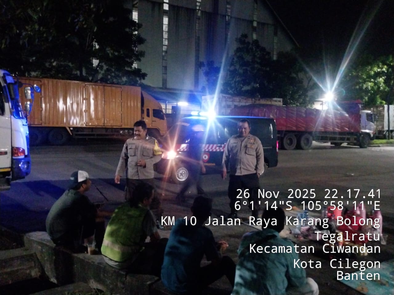Cilegon - Personil Polsek Ciwandan Polres Cilegon Polda Banten Dalam Pelaksanaan Kegiatan Patroli dengan menyalakan lampu rotator berwarna biru di Daerah Hukum Polsek Ciwandan Polres Cilegon Polda Banten dari malam hingga dini hari, dalam rangka menciptakan situasi aman dan kondusif, Kamis (27/11/2025).