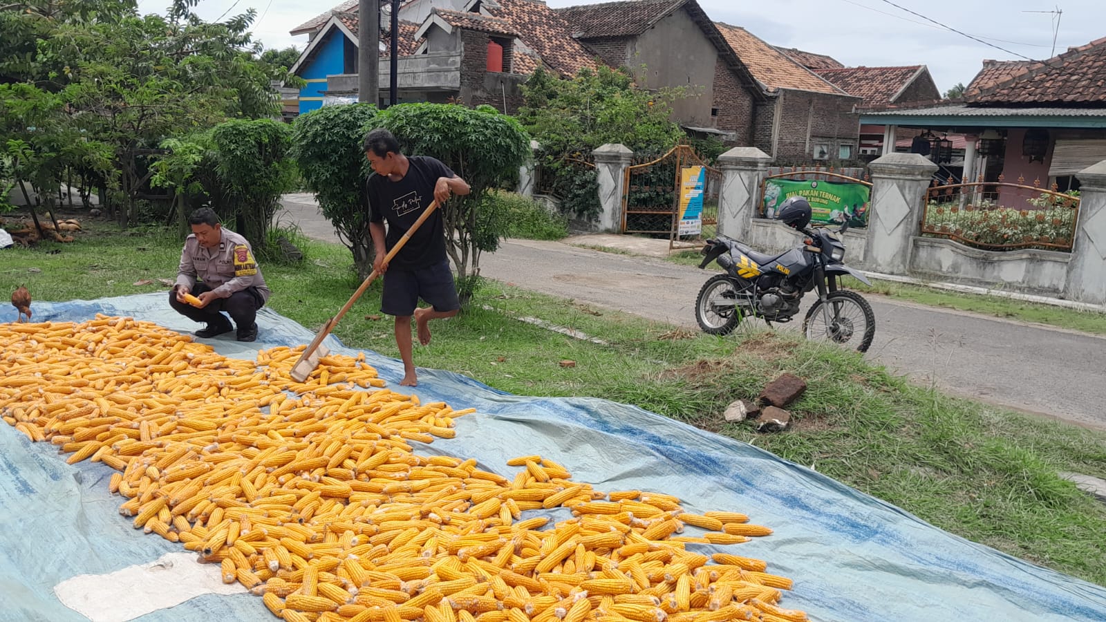 Pada hari itu, Aiptu Wawan bersama beberapa anggota kelompok tani memasang dan menyebarkan tongkol jagung yang baru dipanen ke atas lantai jemuran yang sudah disiapkan. Jagung hibrida yang dijemur merupakan hasil panen terbaru yang diharapkan memberikan hasil panen lebih baik dan manfaat ekonomi bagi petani.