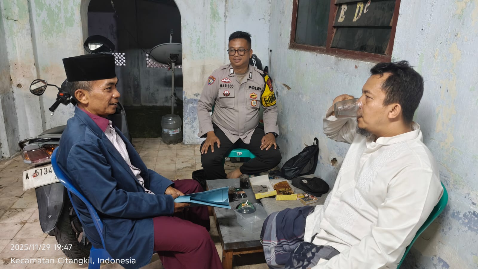 Cilegon - Upaya mengantisipasi aksi kejahatan pada daerah binaan dan memberikan rasa aman dan nyaman kepada warga binaan, Bhabinkamtibmas Polsek Ciwandan Polres Cilegon Polda Banten sambangi warga pada malam hari, Sabtu (29/11/2025).