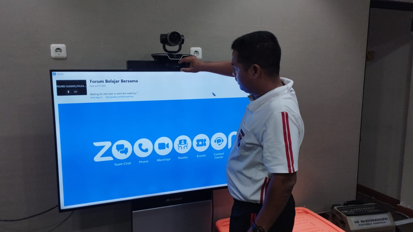 Anggota Tik Polres Cilegon Menyiapkan Sarana dan Prasarana Untuk Kegiatan Zoom meeting Dalam pelaksanaan kegiatan zoom meeting tersebut anggota TIK Polres Cilegon yang bertanggung jawab untuk menyiapkan peralatan zoom. Selain itu agar di tidak ada gangguan jaringan sebelum pelaksanaan anggota TIK melakukan pemeriksaan terhadap sarana dan prasarana tersebut . Satu jam sebelum kegiatan zoom meeting itu dimulai. Kapolres Cilegon AKBP. DR. MARTUA RAJA TARIPAR LAUT SILITONGA. melalui Kasi TIK IPTU Lukman menyampaikan bahwa “untuk menunjang kelancaran penyampaian informasi anggota TIk Polres Cilegon selalu memeriksa sarana dan prasarana tersebut, sebelum maupun pada saat pelaksanaan akan selalu di monitor”