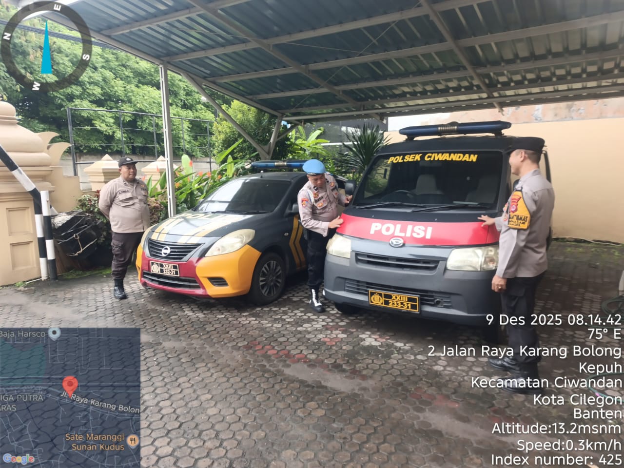 Cilegon - Ka SPKT Polsek Ciwandan Polres Cilegon Polda Banten Pimpin langsung pengecekan kendaraan Dinas Dan Inventaris Polsek Ciwandan Saat Serah terima Tugas Penjagaan, khususnya mobil patroli, Selasa (09/12/2025).