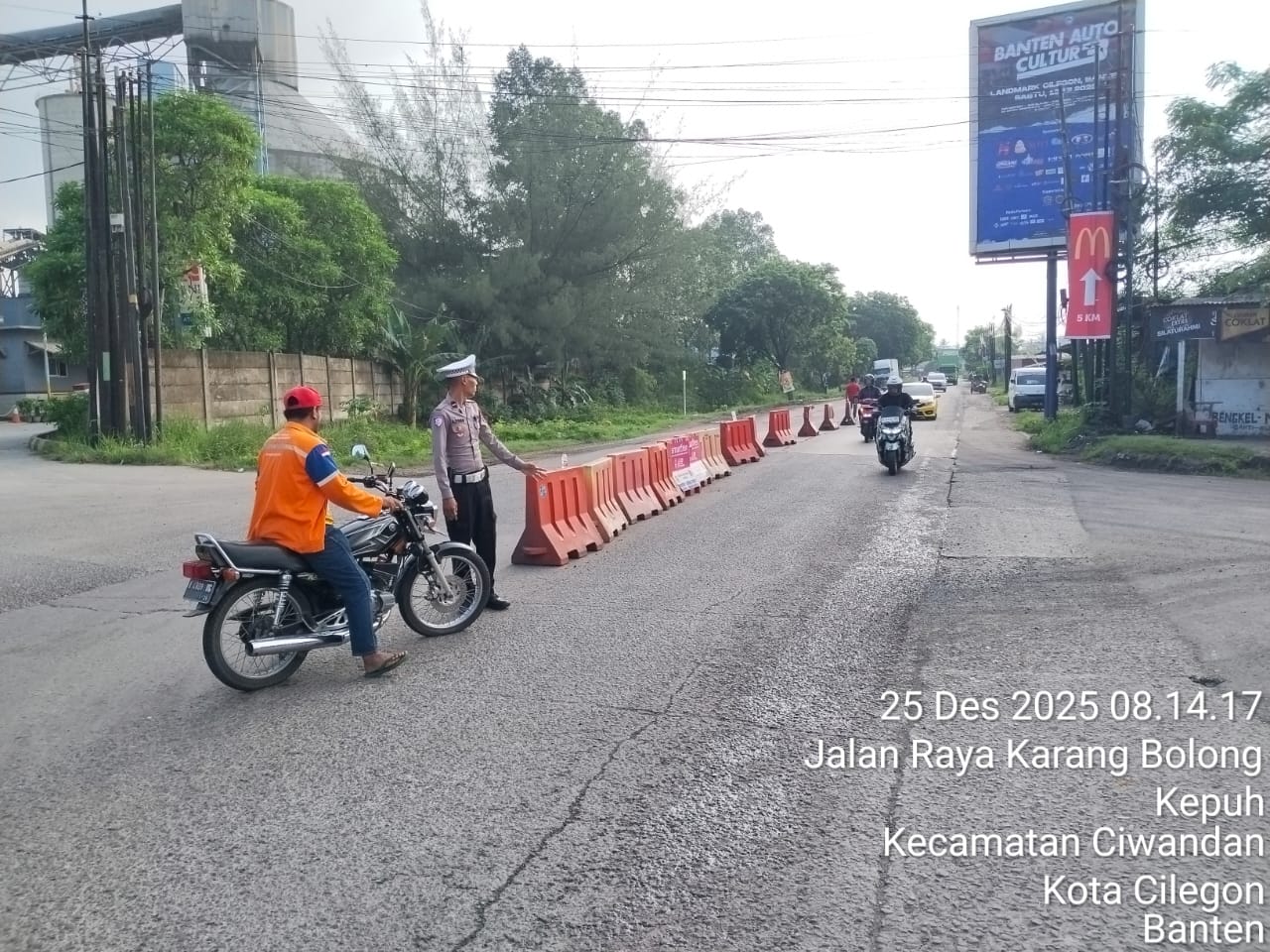 Cilegon - Guna Menciptakan kelancaran arus Mudik Natal tahun 2025 Dan Tahun Baru 2026 yang menuju Pelabuhan Pelindo Dan jalur wisata yang ada di daerah hukum Polsek Ciwandan Polres Cilegon Polda Banten,Pospam 5 Ciwandan berlakukan rekayasa Lalu lintas, Kamis (25/12/2025).
