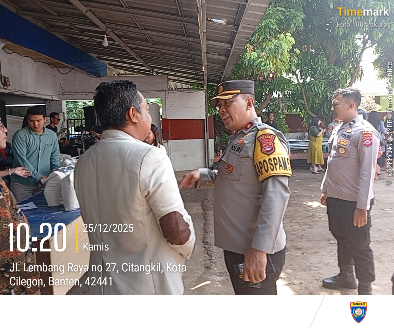 Cilegon – Kapolsek Ciwandan Beserta Personil Polsek Ciwandan Polres Cilegon Polda Banten melaksanakan Pengamanan Tempat Ibadah Umat Kristiani pada kegiatan Ibadah Perayaan Natal Tahun 2023 Di Rumah Doa GBI Pimpinan Pdt. Paul Lingkungan Lembang RT. 002 RW. 004 Kecamatan Citangkil Kota Cilegon, Kamis (25/12/2025).