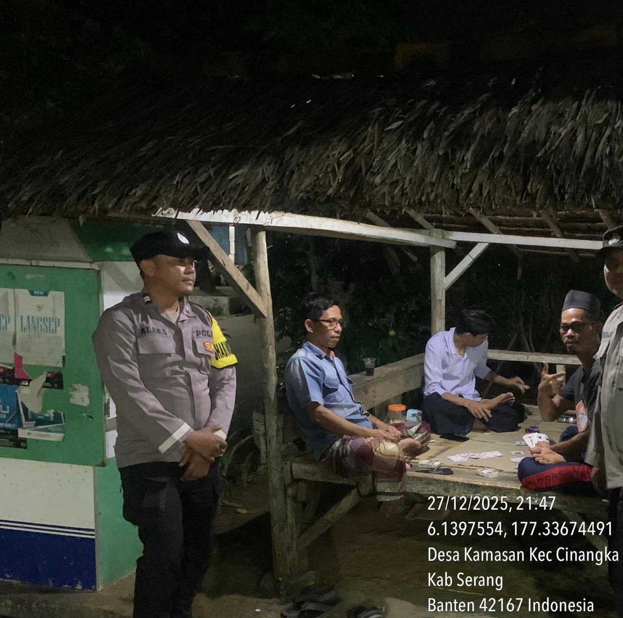 *Polres Cilegon* || Personel Bhabinkamtibmas Polsek Cinangka melaksanakan Program Komandan Wish Kapolda Banten RONDA SATKAMLING menyampaikan komunikasi dengan Petugas Siskamling agar berperan aktif dalam menciptakan Harkamtibmas yang aman dan Kondusif, Minggu (28/12/2025).