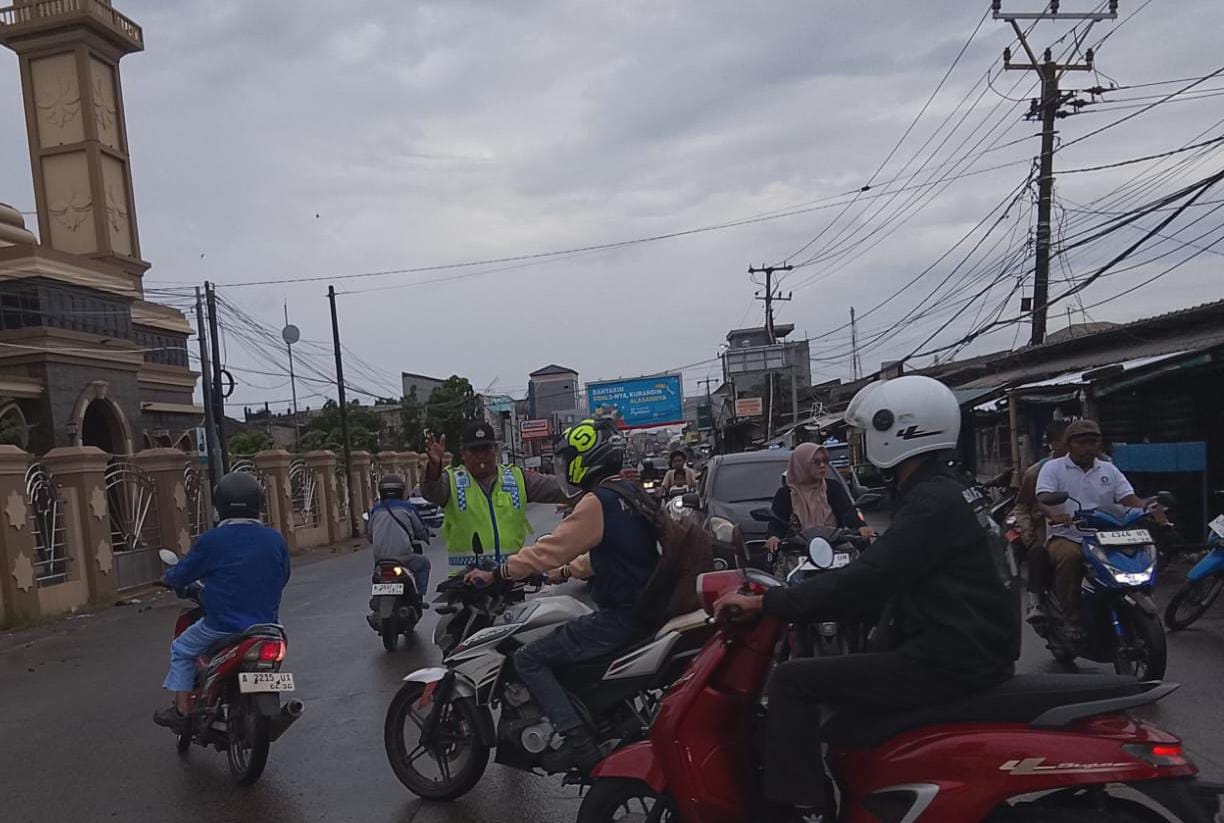 Anggota Polsek Anyar Mengurai Kendaraan Dengan Melaksanakan Pengaturan Lalu Lintas