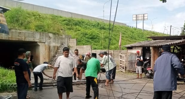 Personel Bhabinkamtibmas Polsek Purwakarta Aipda Nugraha turut serta membantu mengangkat tiang internet yang roboh di lingkungan Kaligandu Kidul, Rabu (tanggal dapat disesuaikan)