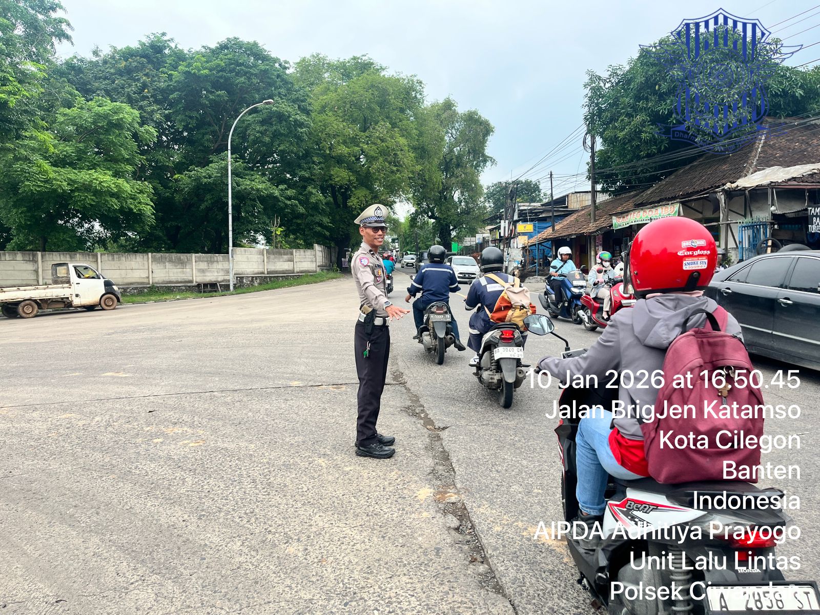 Cilegon - Personil Unit Lantas Polsek Ciwandan Polres Cilegon Polda Banten melaksanakan kegiatan monitoring jalur wisata di depan Pos Lantas JLS Ciwandan, Sabtu (10/01/2026).