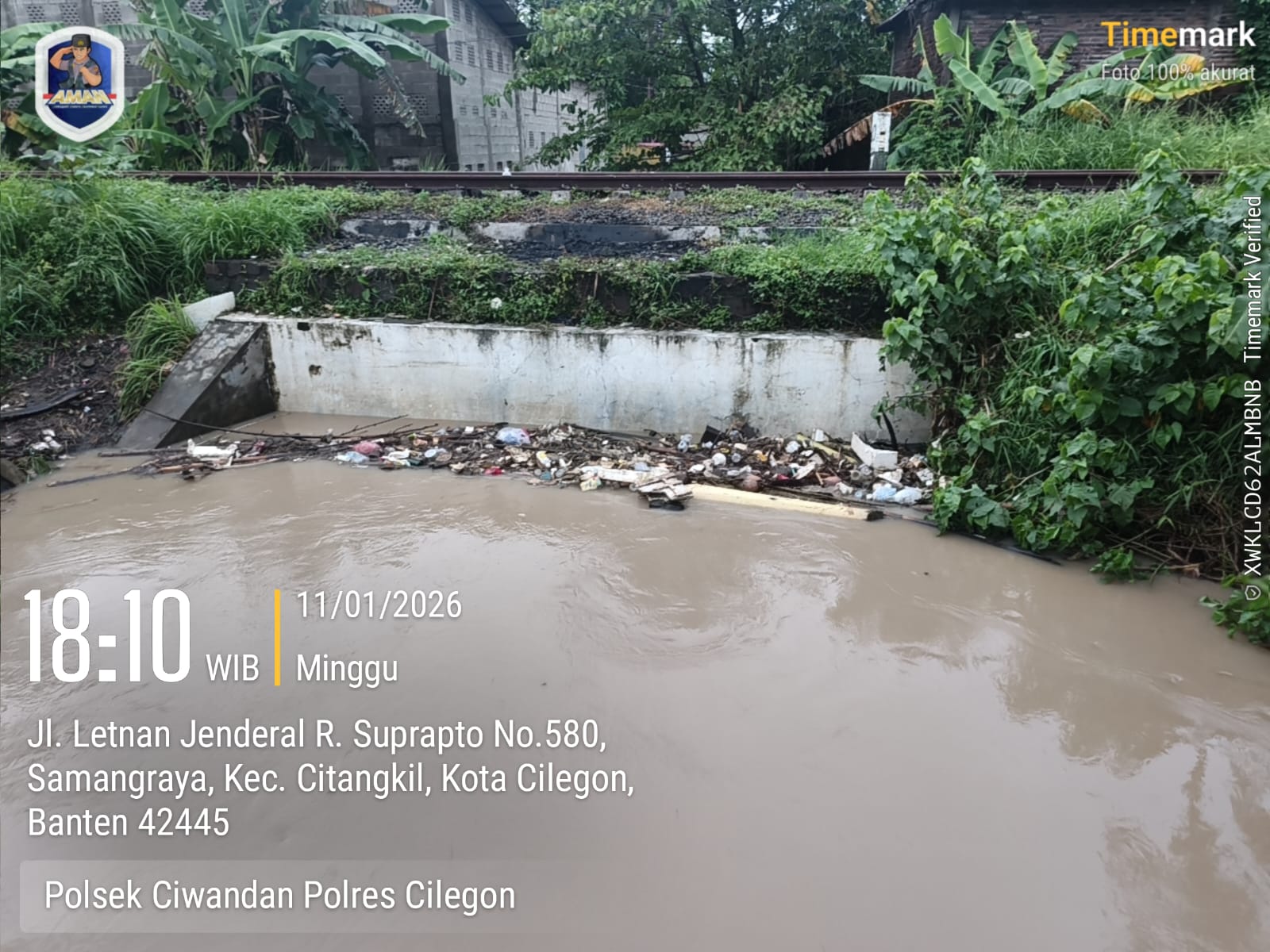Cilegon - Dalam rangka antisipasi bencana alam personil Polsek ciwandan mengecek debit air di beberapa titik aliran sungai salah satunya yaitu kalimuk RT 005 RW 006 Kelurahan samang Raya Kecamatan citangkil Kota Cilegon, Minggu (11/01/2026).