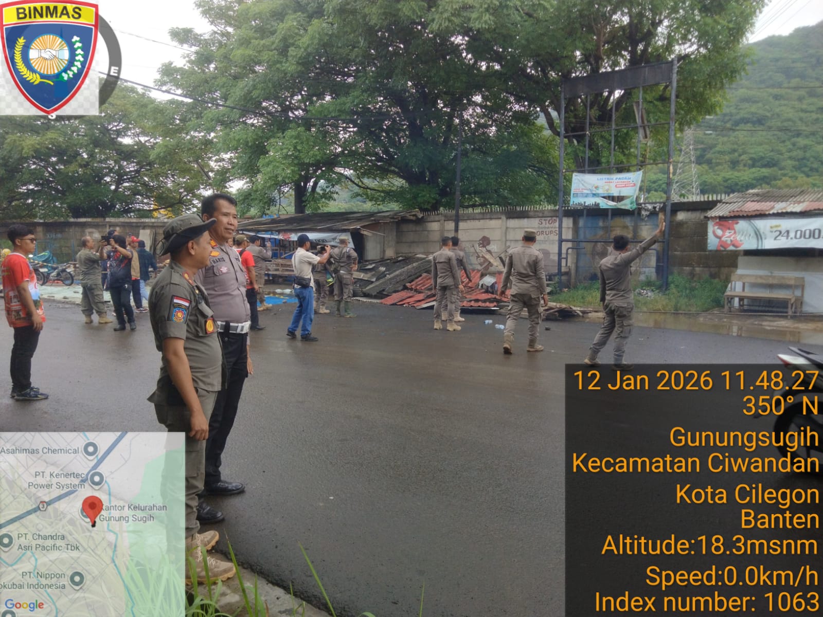 Cilegon - Personil Polsek Ciwandan Polres Cilegon Polda Banten melakukan pengawasan pembongkaran bangunan liar di atas tandon di Jl. Sunan Kali Jaga, Kelurahan Gunung Sugih, Kecamatan Ciwandan, Kota Cilegon. Senin (12/01/2026).
