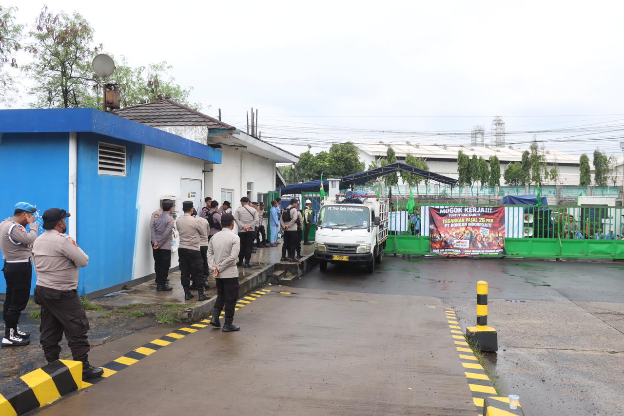 Cilegon – Polres Cilegon Polda Banten melaksanakan pengamanan kegiatan aksi unjuk rasa lanjutan yang digelar Dewan Pimpinan Cabang Federasi Serikat Pekerja Kimia, Energi dan Pertambangan (DPC FSPKEP) Kota Cilegon di depan Gerbang Masuk PT. Dongjin Indonesia, Jalan Raya Anyer–Sirih Km. 122, Kelurahan Gunungsugih, Kecamatan Ciwandan, Kota Cilegon, Rabu (14/1/2026).