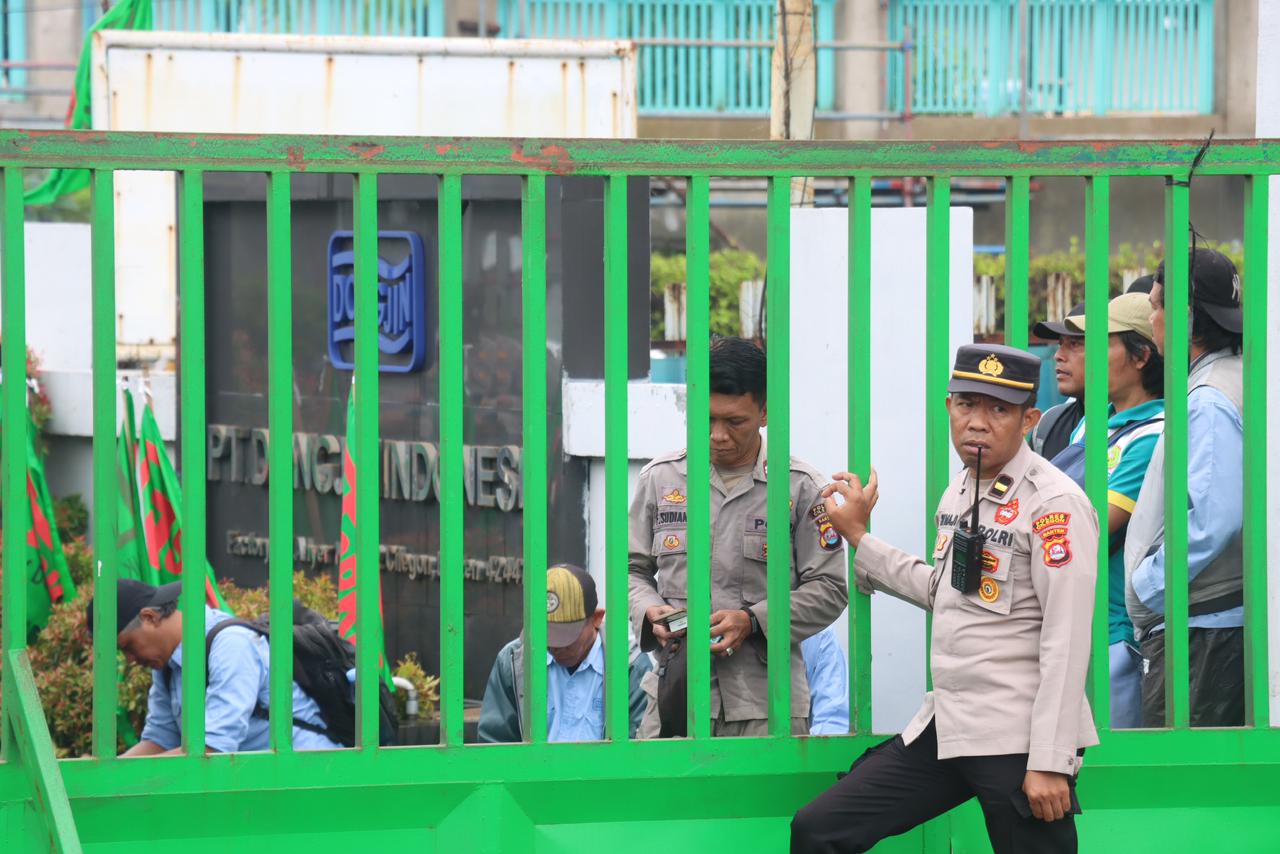 Cilegon – Polres Cilegon Polda Banten melaksanakan pengamanan kegiatan aksi unjuk rasa lanjutan yang digelar Dewan Pimpinan Cabang Federasi Serikat Pekerja Kimia, Energi dan Pertambangan (DPC FSPKEP) Kota Cilegon di depan Gerbang Masuk PT. Dongjin Indonesia, Jalan Raya Anyer–Sirih Km. 122, Kelurahan Gunungsugih, Kecamatan Ciwandan, Kota Cilegon, Rabu (14/1/2026).
