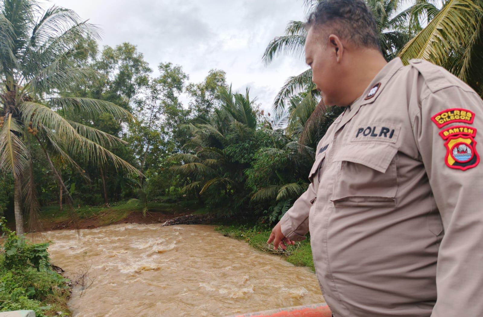 Personel Polsek Anyar Polres Cilegon Polda Banten melaksanakan Patroli kewilayahan mengecek debit air di Sungai pasca Hujan antisipasi banjir di wilayah Kec. Anyar, Rabu (14/01).