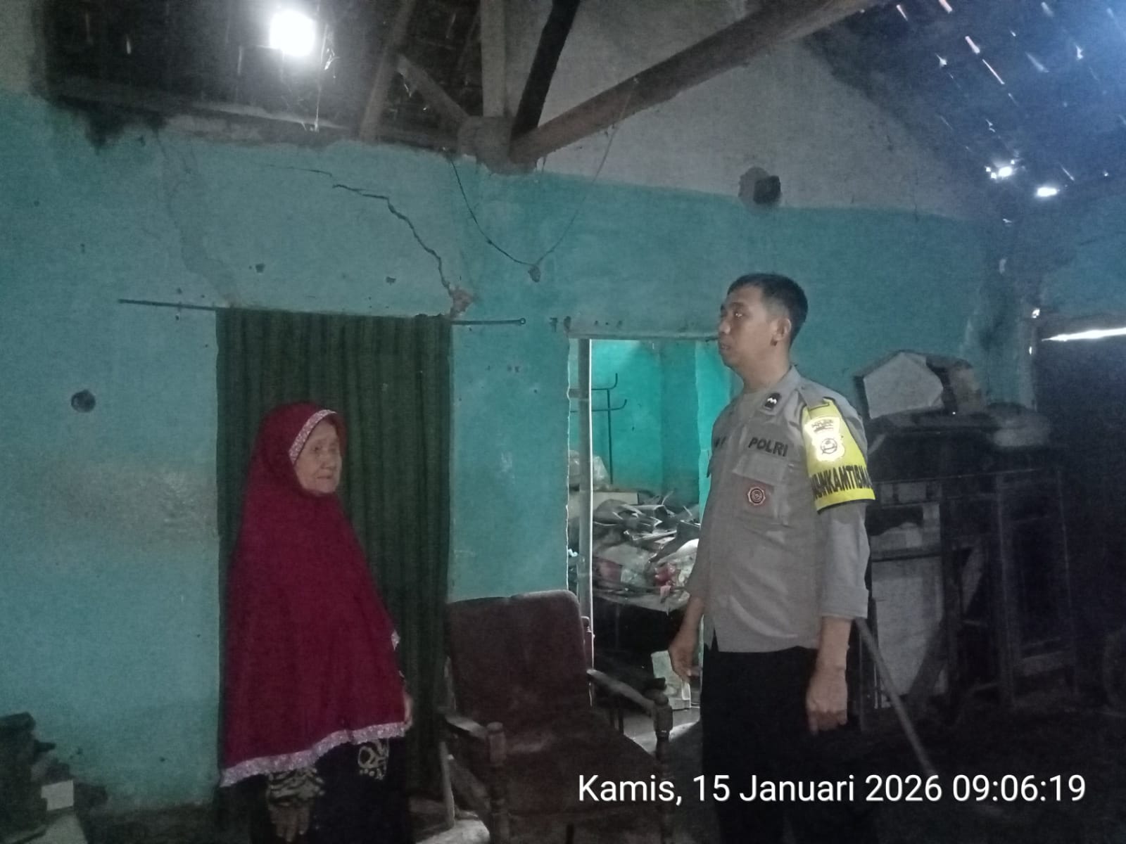 Cilegon - Bhabinkamtibmas Kelurahan Tamanbaru AIPDA Edianto, mengunjungi Ibu Marni yang rumahnya roboh bagian dapur akibat hujan angin di Lingkungan Sondol Rt. 03/02 Kelurahan Tamanbaru Kecamatan Citangkil, Kamis (15/01/2026).
