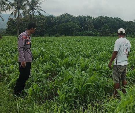 Dalam kegiatan monitoring ini, Bhabinkamtibmas meninjau langsung kondisi lahan jagung.
