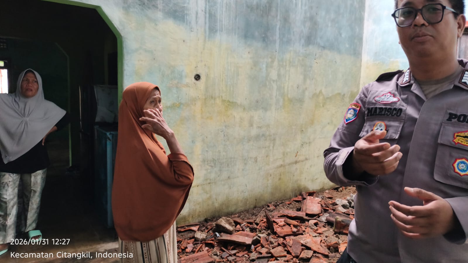 Pada pukul 12.00 WIB, Petugas Bhabinkamtibmas mendapatkan informasi bahwa ada atap rumah roboh milik Sdri. Halunah. Petugas melakukan TPTKP dan diketahui bahwa atap rumah area tengah roboh, namun tidak ada korban jiwa dalam kejadian tersebut. Rumah tersebut dihuni oleh 3 orang.