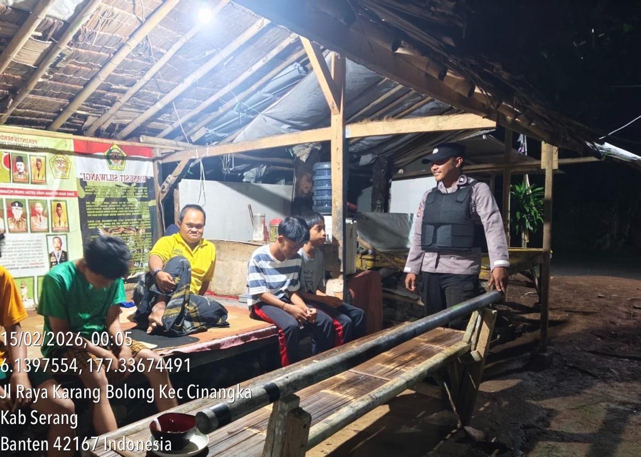 *Polres Cilegon* || Personil Bhabinkamtibmas Polsek Cinangka melaksanakan Program Komandan Wish Kapolda Banten RONDA SATKAMLING menyampaikan komunikasi dengan Petugas Siskamling agar berperan aktif dalam menciptakan Harkamtibmas yang aman dan Kondusif, Minggu (15/02/2026).