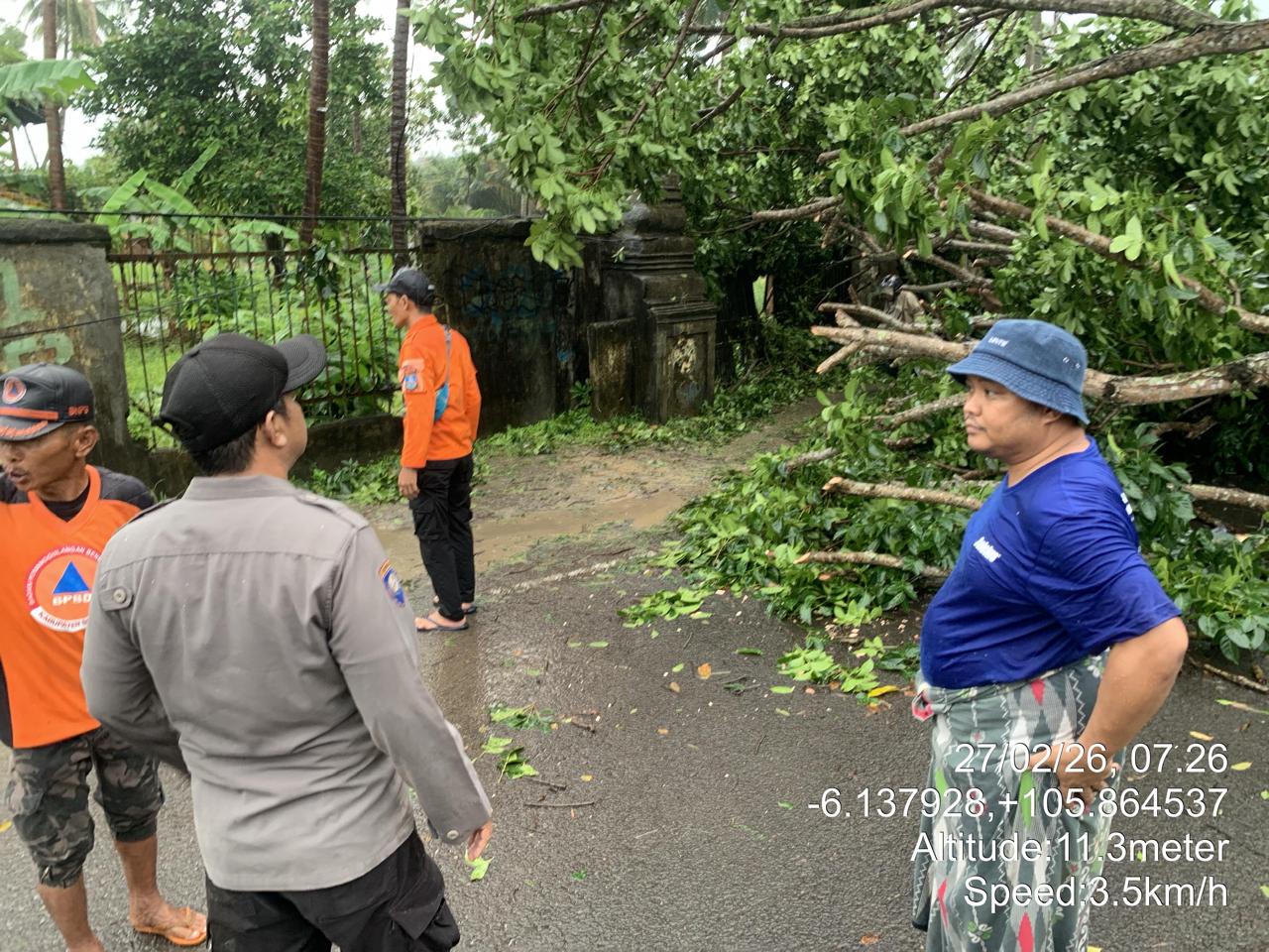*Polres Cilegon* - di Jalan Raya Cinangka-Anyer tepatnya di Kp. Lebak Sawo Ds. Sindanglaya Kec. Cinangka Kab. Serang telah terjadi pohon tumbang yang disebabkan oleh Angin dan Pohon yang sudah berumur tua, Jumat (27/022026).