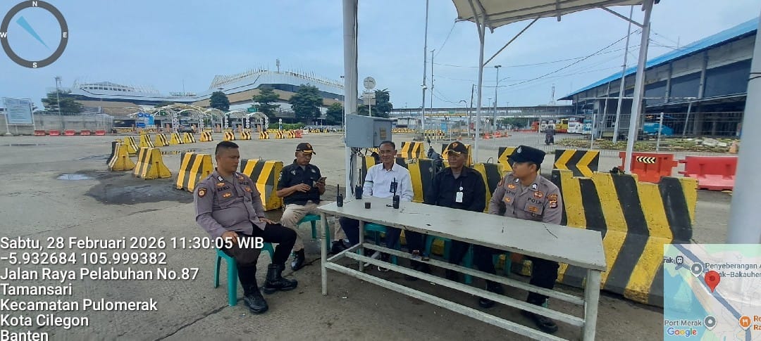 \Cilegon - Personel Polsek Kskp Merak Polres Cilegon Polda Banten melaksanakan sambang dan patroli kawasan pelabuhan merak dalam rangka menjaga Harkamtibmas di Kawasan Pelabuhan Merak, Sabtu (28/02/2026).