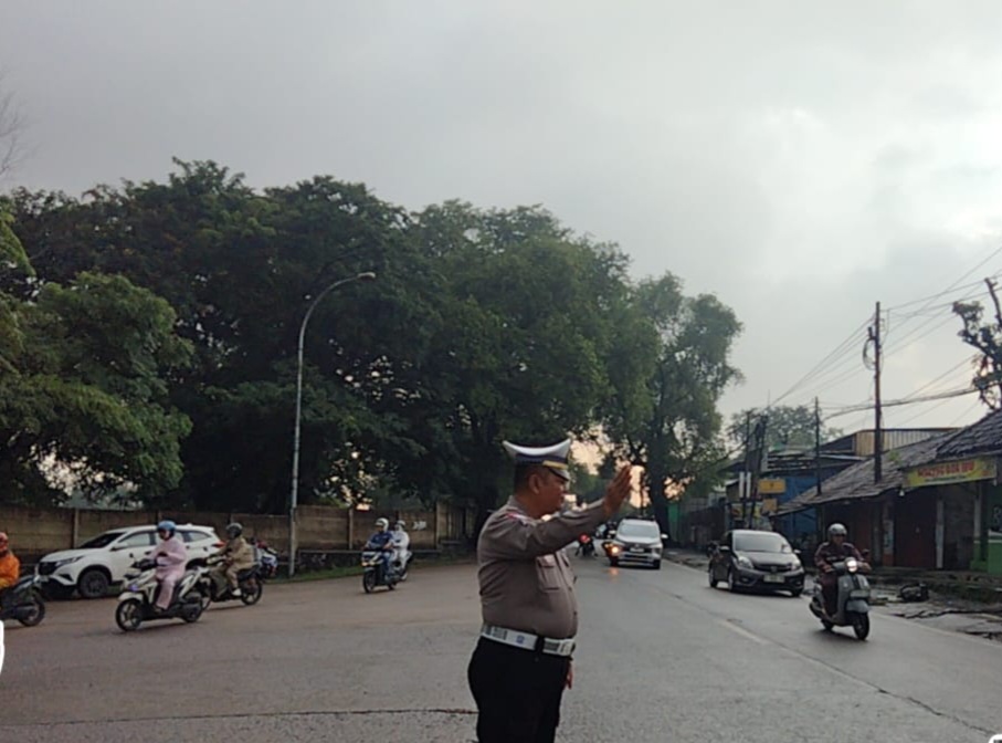 Cilegon - Guna Kelancaran Lalu-lintas Personil Unit Lantas Polsek Ciwandan Polres Cilegon Polda Banten melaksanakan pengaturan lalu-lintas di Simpang Beringin Ciwandan Pertigaan Kawasan Industri KSP/ KIEC I kelurahan Warnasari Kecamatan Citangkil Kota Cilegon, Senin (09/03/2026).