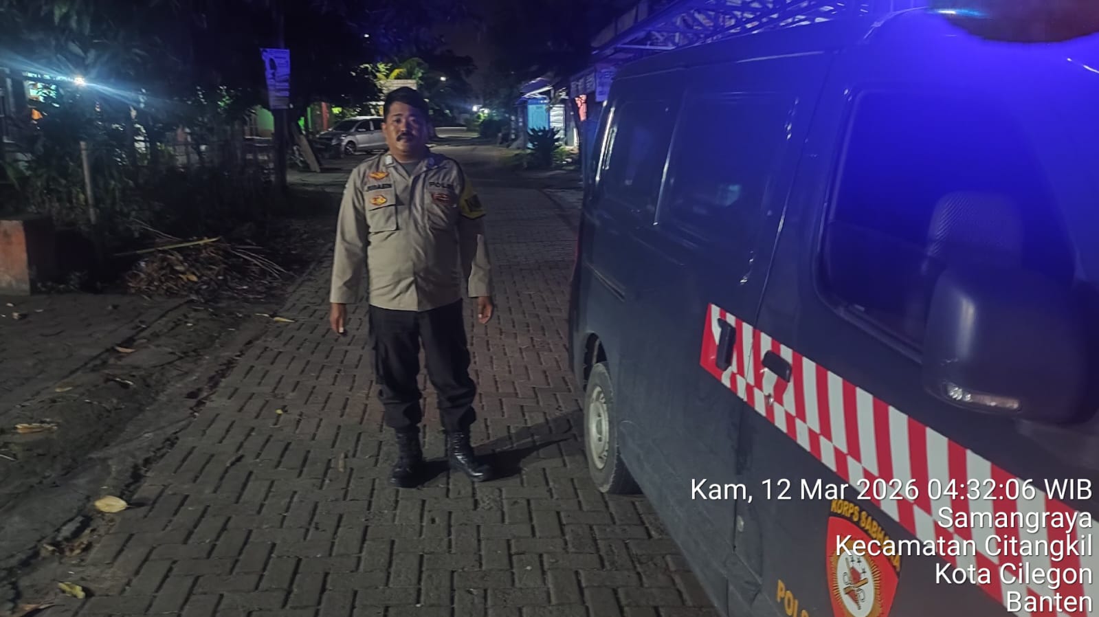 Cilegon - Personil Polsek Ciwandan Polres Cilegon Polda Banten Dalam Pelaksanaan Kegiatan Patroli dengan menyalakan lampu rotator berwarna biru di Daerah Hukum Polsek Ciwandan Polres Cilegon Polda Banten dari malam hingga dini hari, dalam rangka menciptakan situasi aman dan kondusif, Kamis (12/03/2026).