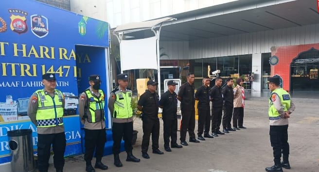 -Polres Cilegon-, 17 Maret 2026 – Polda Banten   Dalam rangka memastikan keamanan dan kelancaran perayaan Hari Raya Idul Fitri 1447 Hijriah/2026 Masehi, Ipda Azis Wahyudin selaku Penanggung Jawab Pos Pengamanan (Pos Pam) 3 Landmark Polsek Purwakarta Polres Cilegon memimpin apel pengamanan di lokasi tersebut, Selasa. (17/3).
