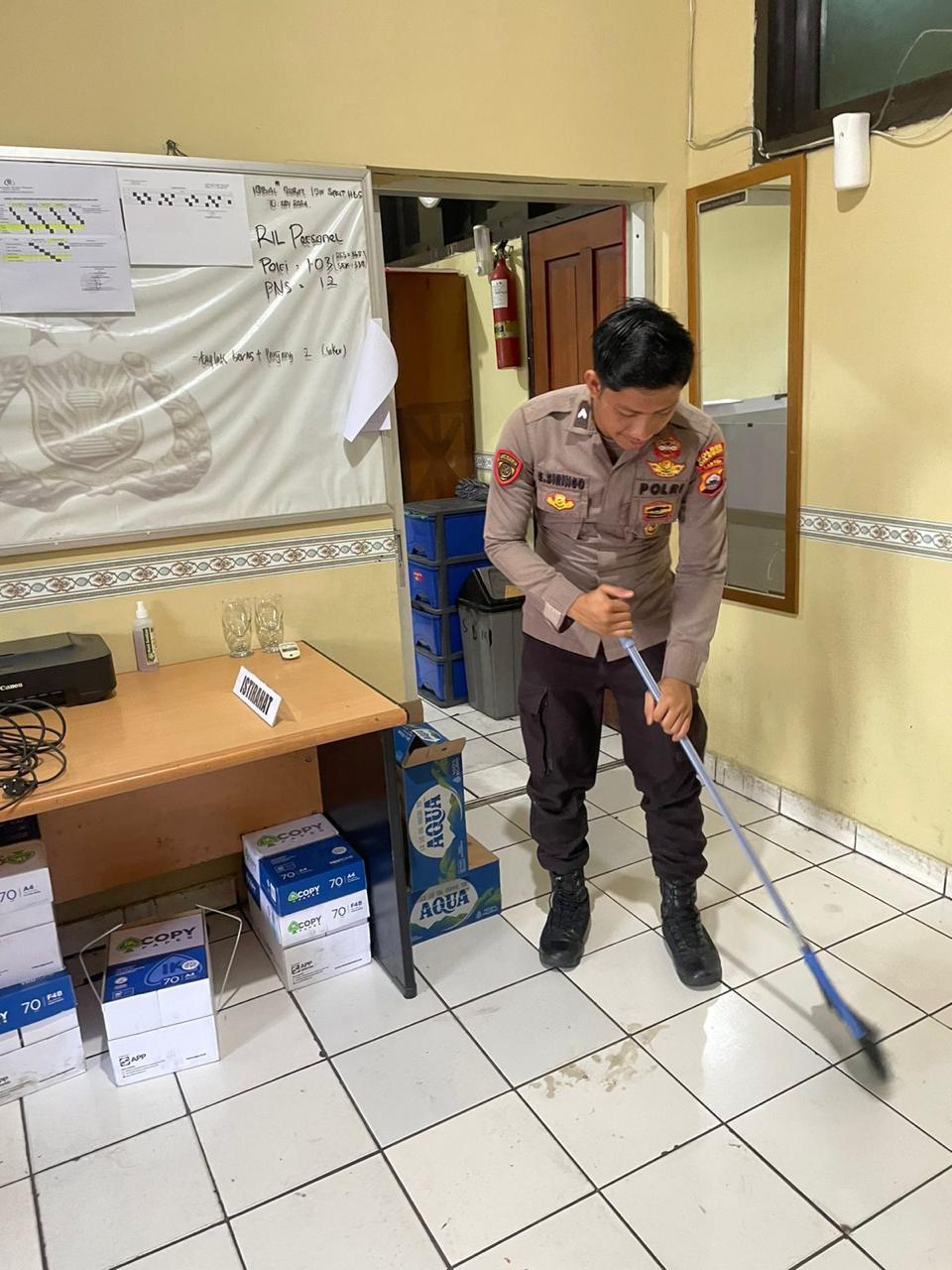 Anggota Bag SDM Polres Cilegon, melaksanakan Kegiatan Bersih bersih ruangann kerja agar terciptanya nyaman dan bersih