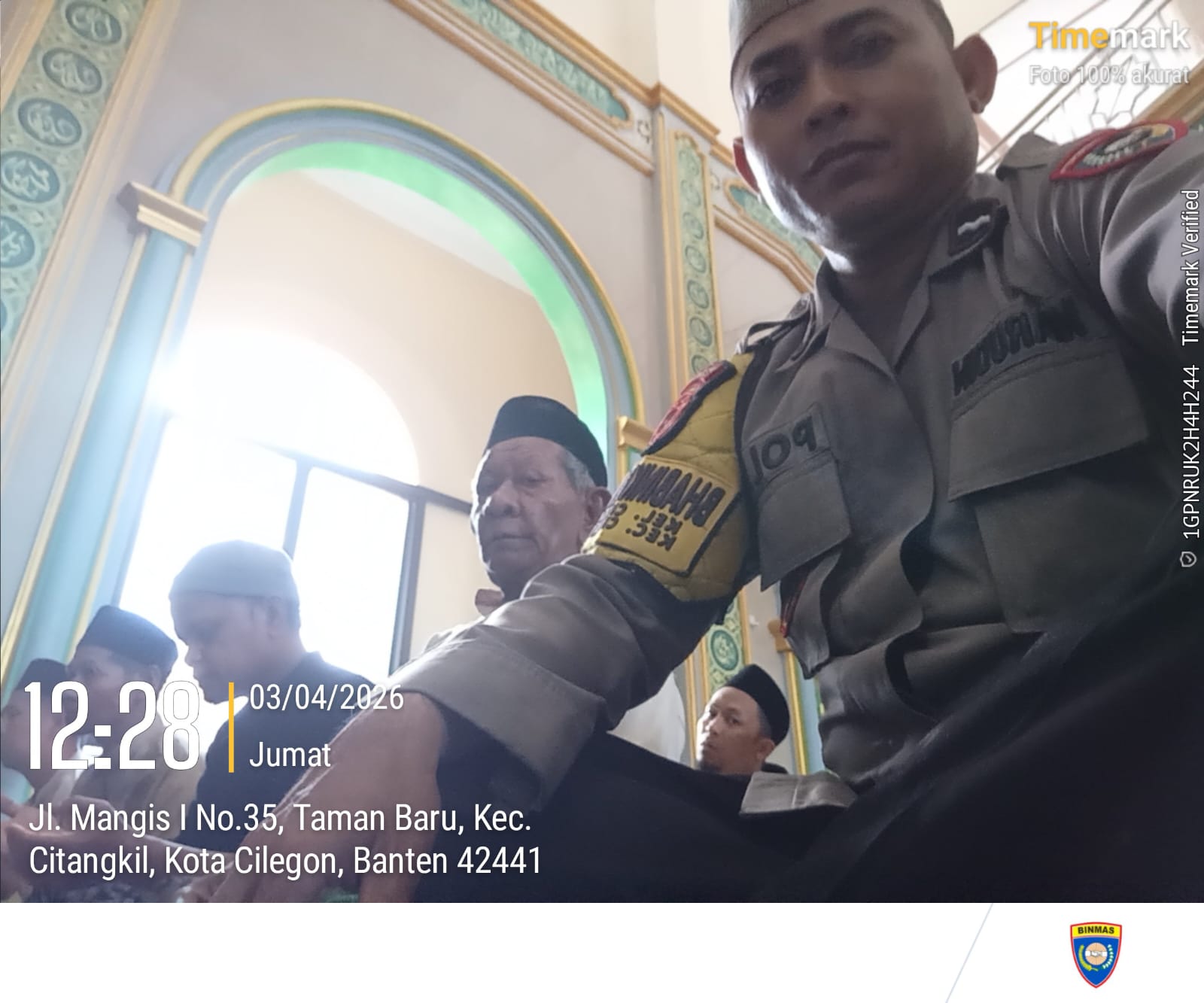 Cilegon - Bhabinkamtibmas Polsek Ciwandan Polres Cilegon Polda Banten Selesai melaksanakan Sholat secara berjama’ah dan Sampaikan Himbauan-himbauan Kamtibmas Kepada Masyarakat Jama'ah Yang ada Dimasjid, Jum'at (03/04/2026).