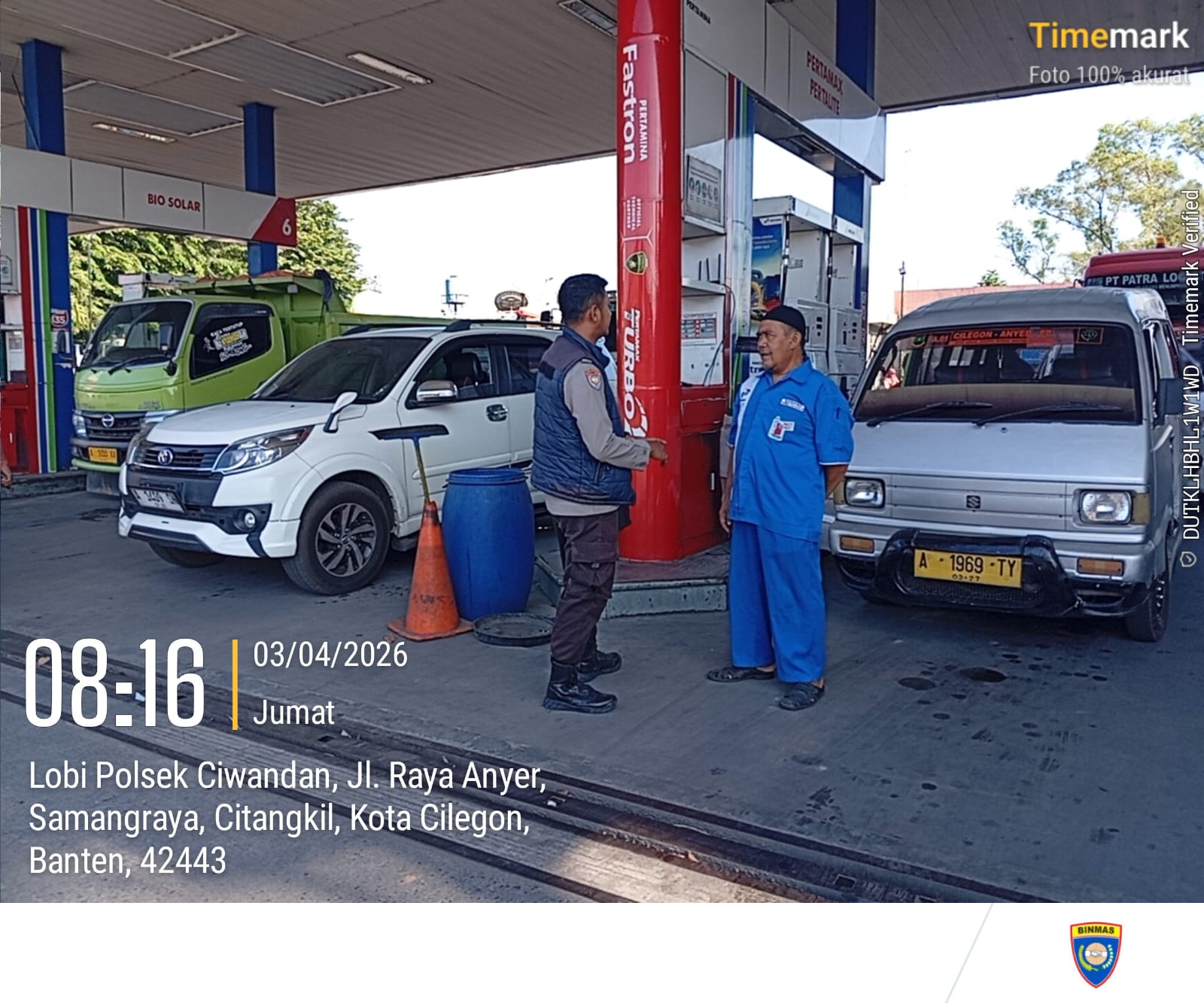 Cilegon - Kepolisian Polsek Ciwandan Polres Cilegon Polda Banten, melakukan pengecekan stok Bahan Bakar Minyak (BBM) di dua SPBU di wilayah Ciwandan, Cilegon, Jum'at (03/04/2026).
