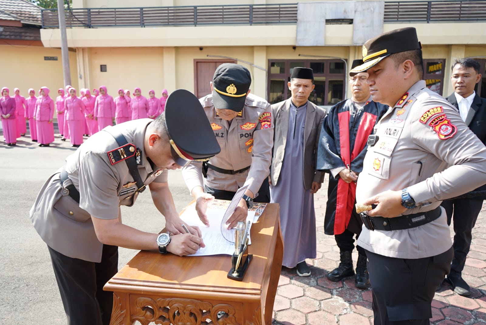 Cilegon - Kapolres Cilegon AKBP Dr. Martua Raja Taripar Laut Silitonga S.H S.IK M.S.I, memimpin langsung upacara pengangkatan dan serah terima jabatan (sertijab) tiga kapolsek di jajaran Polres Cilegon Polda Banten, kapolsek Kp Banten,Kapolsek Bojonegara  dan Kapolsek Puloampel, selasa ,14/4/26