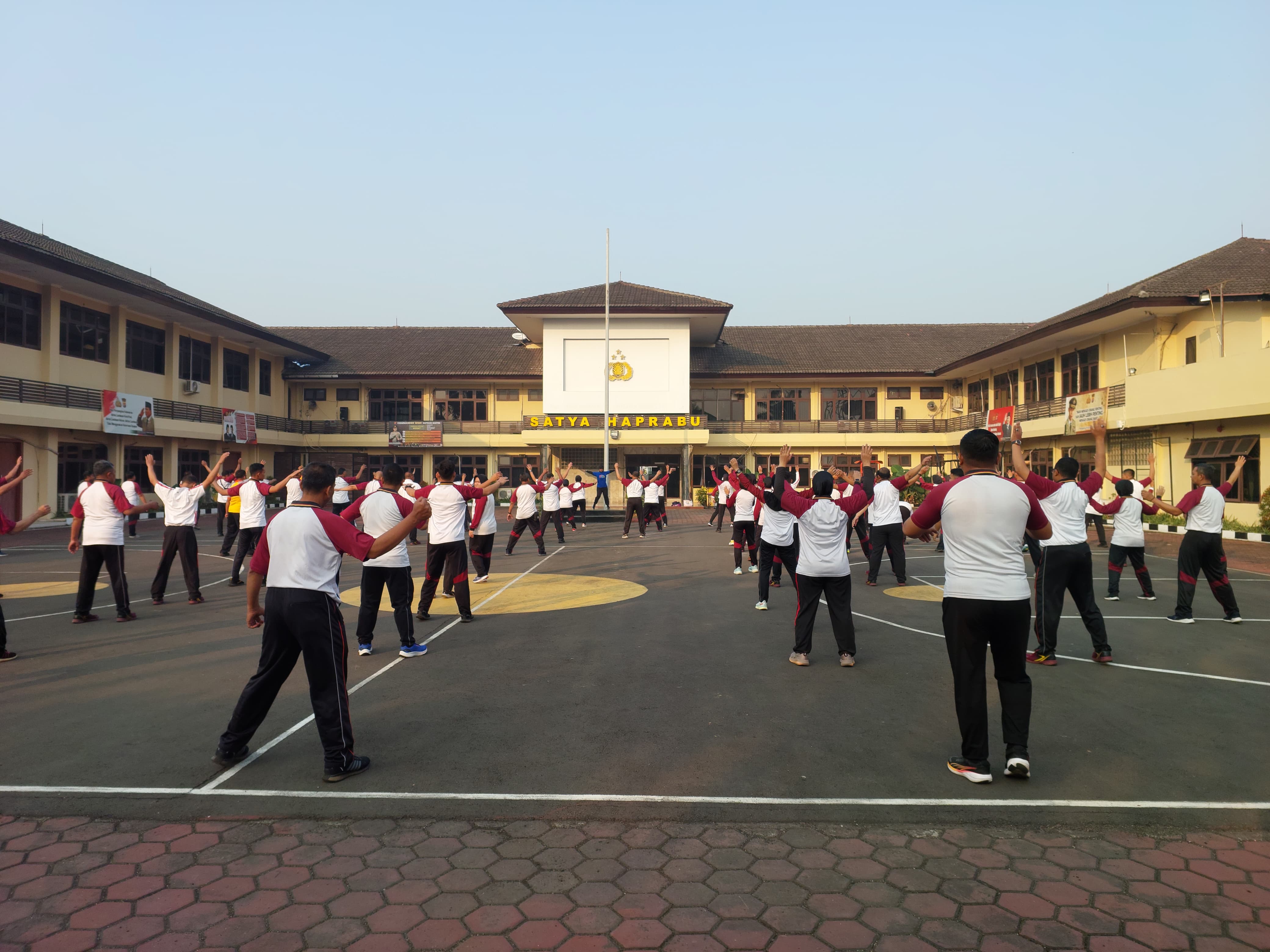 Cilegon,Polres Cilegon Polda Banten Pada Jumat/24/04/2025 Pukul 07.15 Wib, Personil  Polres Cilegon, melaksanakan kegiatan olahraga mandiri di lapangan Polres Cilegon dan melaksanakan senam aerobik di Lapangan polres cilegon.