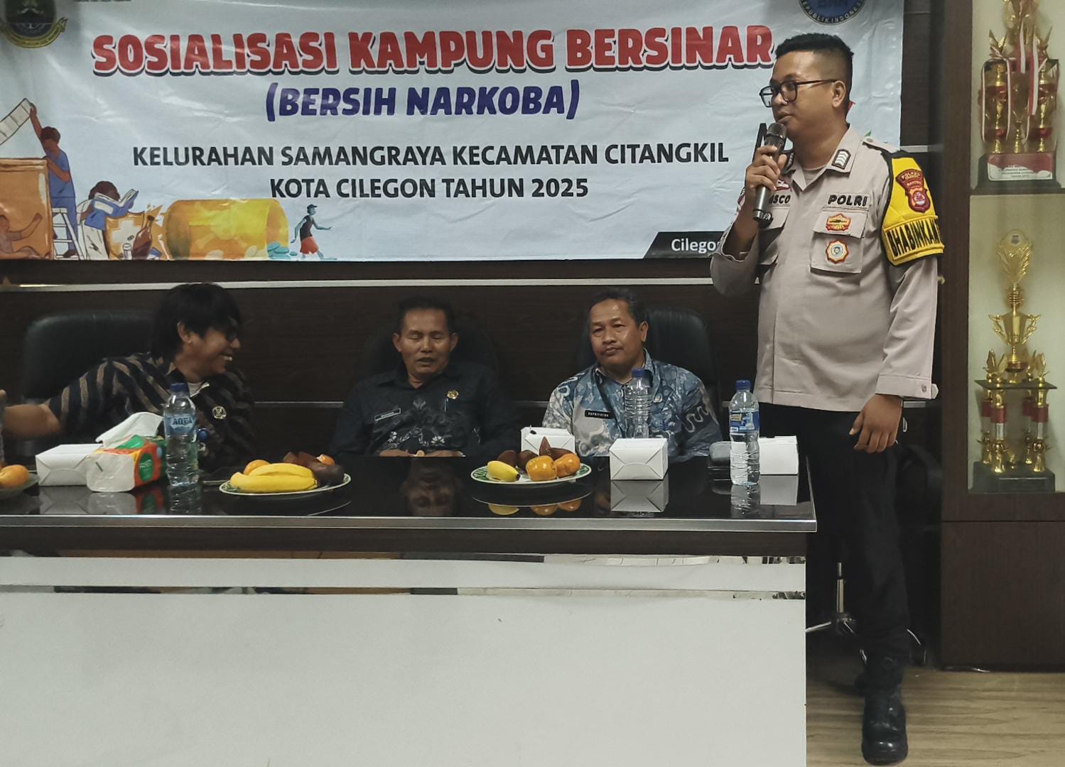 Cilegon - Bertempat di Aula Kantor Kelurahan Samangraya, Bhabinkamtibmas Kelurahan Samangraya Polsek Ciwandan Polres Cilegon Polda Banten BRIPKA Asep Karyudin Hadiri Sosialisasi Kampung Bersih Narkoba (Bersinar), Kamis (02/10/202).