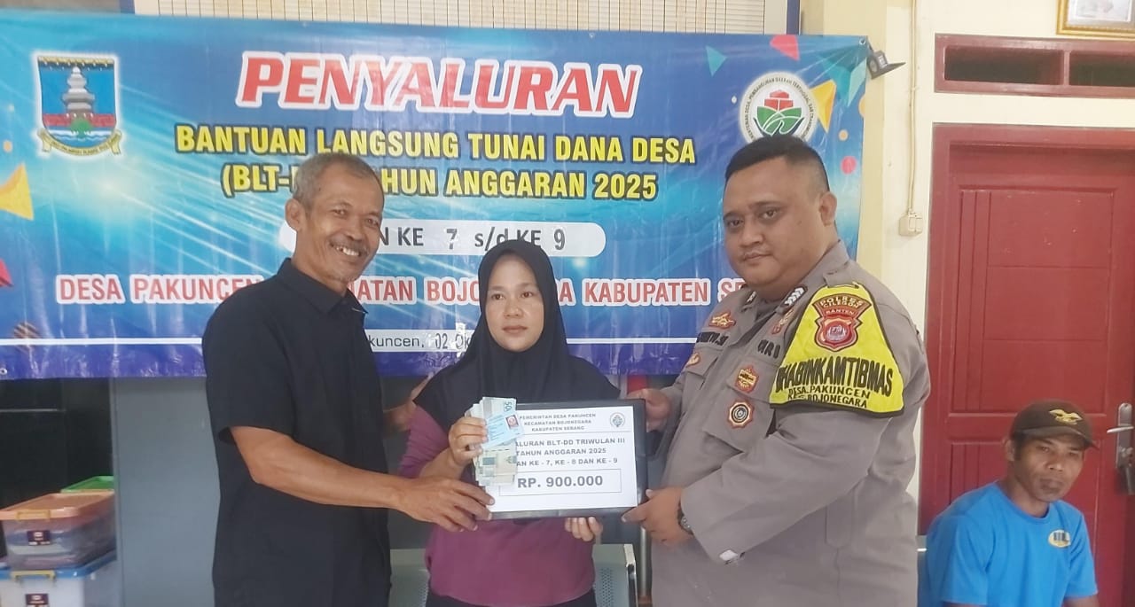 Cilegon ~ Personel Bhabinkamtibmas Polsek Bojonegara Polres Cilegon Polda Banten, melaksanakan kegiatan pengamanan dan pengawalan penyaluran Bantuan Langsung Tunai Dana Desa (BLT-DD) di Desa Pakuncen , sebagai upaya dalam menghadirkan rasa aman bagi warga masyarakat penerima bantuan tersebut. Jumat (03/10/2025).