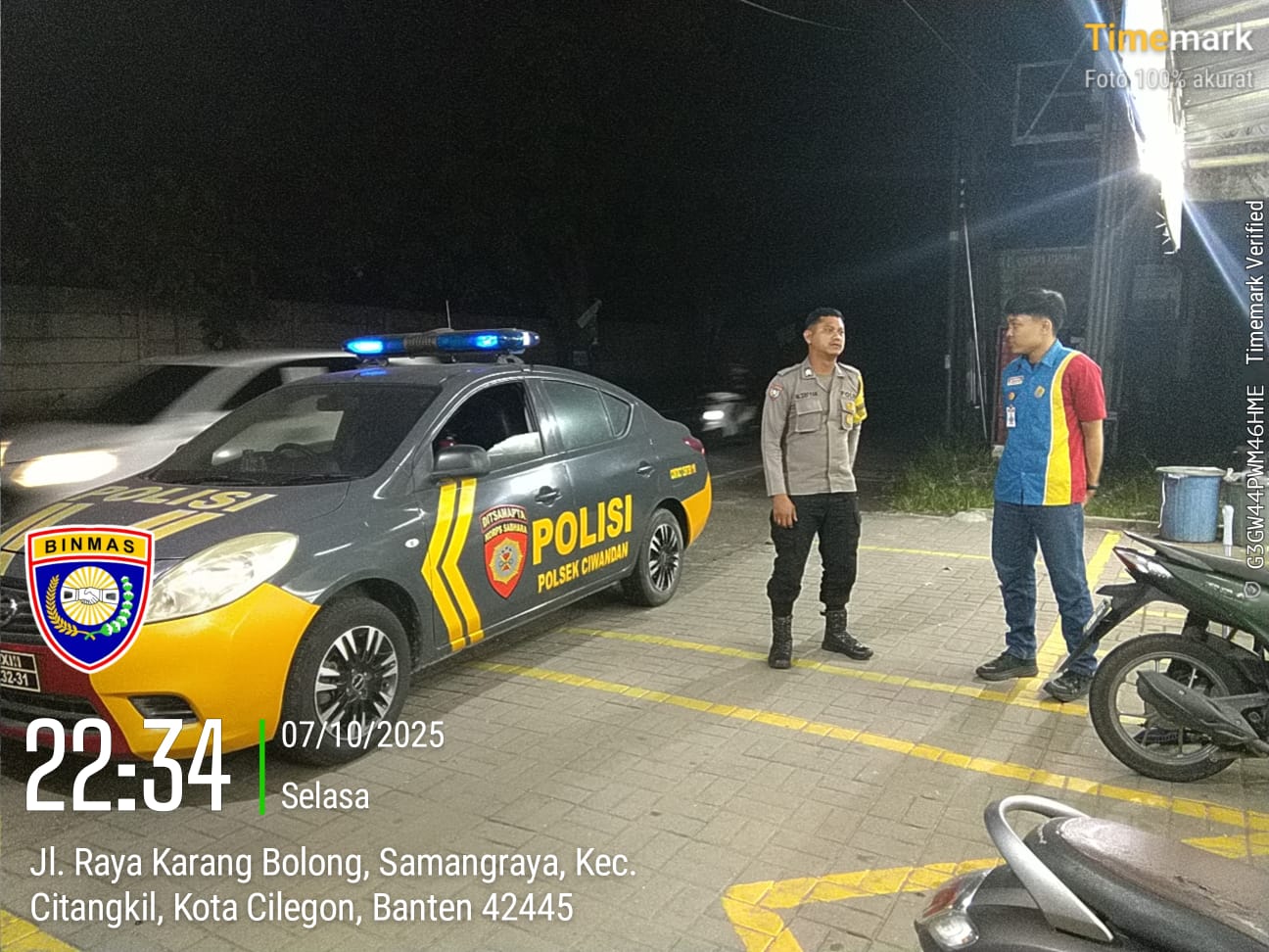 Cilegon - Personil Polsek Ciwandan Polres Cilegon Polda Banten melaksanakan patroli malam untuk mengantisipasi potensi kejahatan, khususnya pembobolan minimarket, di daerah hukum Polsek Ciwandan. Kegiatan ini bertujuan untuk meningkatkan keamanan dan memberikan rasa aman kepada masyarakat, Rabu (08/10/2025).