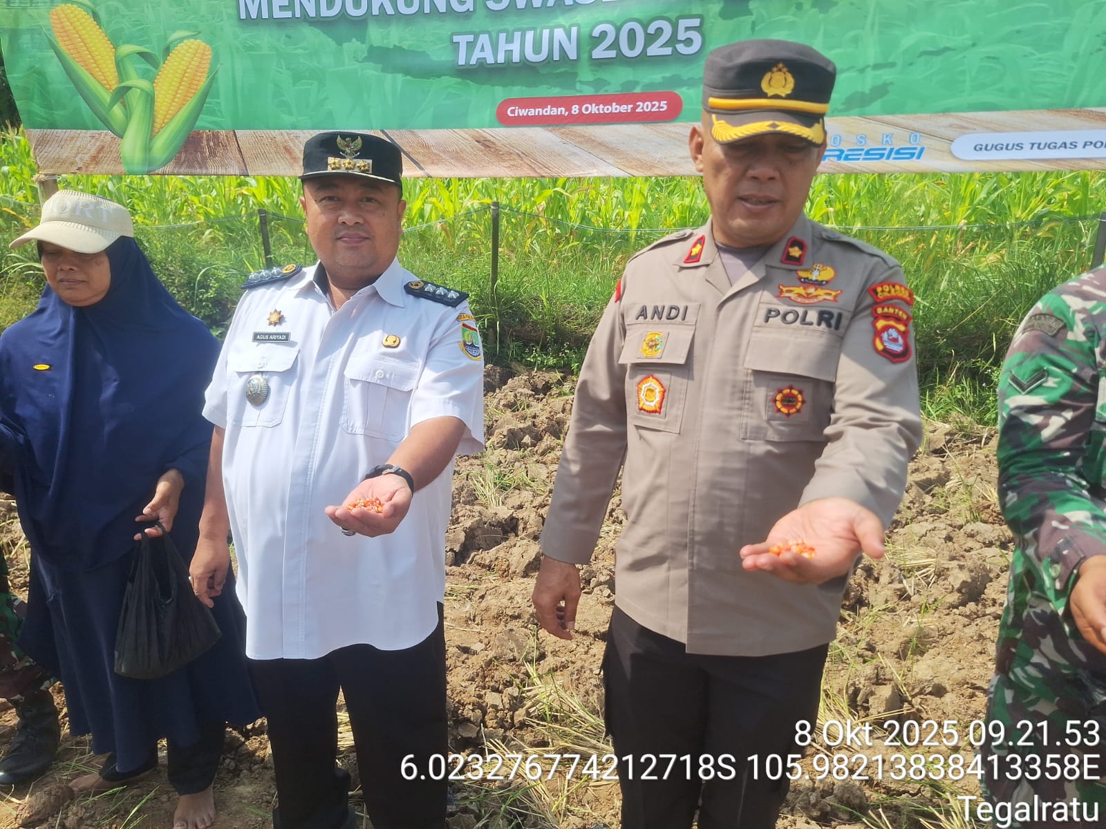 Cilegon - Dalam Rangka Mendukung Asta Cita Presiden Republik Indonesia Tentang Ketahanan Pangan,secara Serentak Penanaman Jagung Kapolsek Ciwandan KOMPOL Andi Suherman Dan Forkopimcam Kecamatan Ciwandan Turun Langsung ke lahan Penanaman jagung secara Serentak Bersama Personil Dan masyarakat, Rabu (08/10/2025).